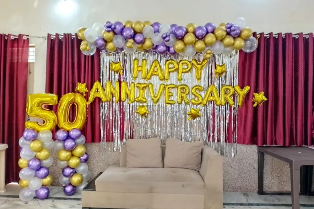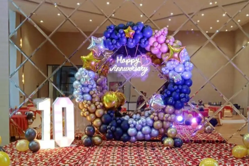 Celebrate a decade of love and togetherness with this beautiful 10th anniversary ring decoration. The elegant ring setup with golden and pink chrome balloons creates a stunning backdrop for photos and celebrations. It’s a perfect way to make this special milestone memorable and unforgettable for the couple. 💕🎉✨