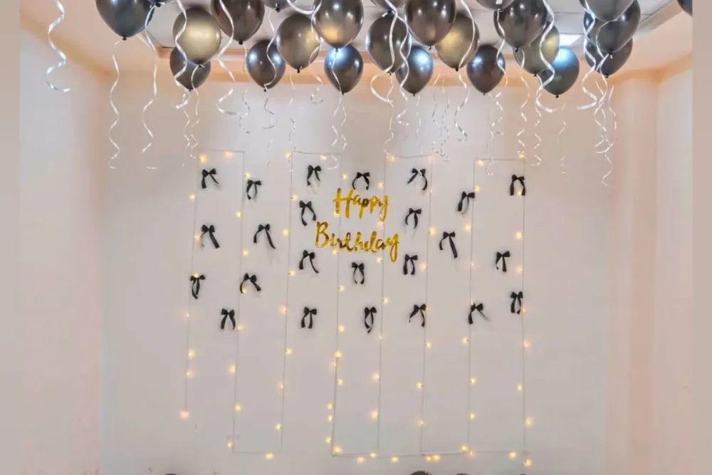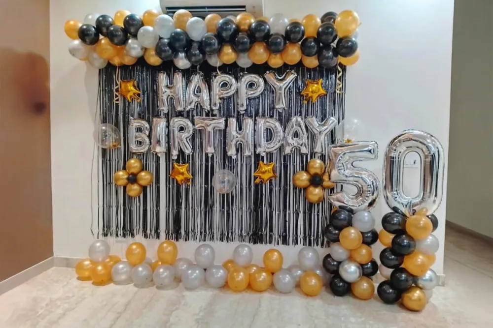 Celebrate your special day with this stunning black and golden birthday decoration. The elegant balloon arch, stylish backdrop, and shiny chrome balloons create a grand and luxurious party setup. It’s the perfect decoration to make your birthday celebration look classy, festive, and truly unforgettable. 🎉
