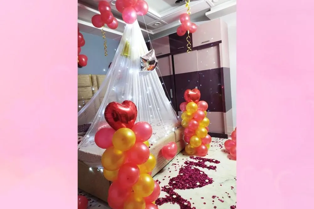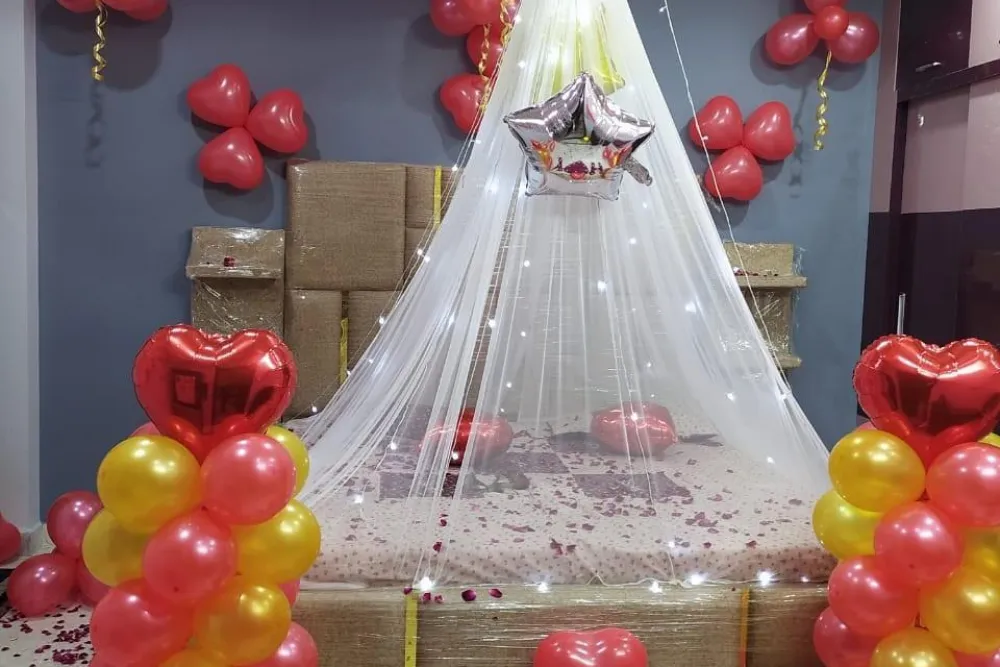 Surprise your partner with this beautiful cabana setup decoration and create a romantic atmosphere. The canopy-style setup with net cloth, heart balloons, rose petals, candles, and fairy lights adds a dreamy and intimate vibe. It’s a perfect decoration to make your special moments more romantic, memorable, and full of love. ❤️✨🎈
