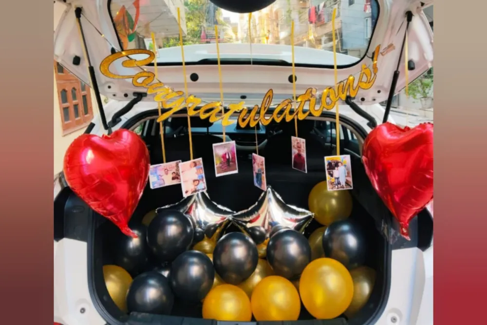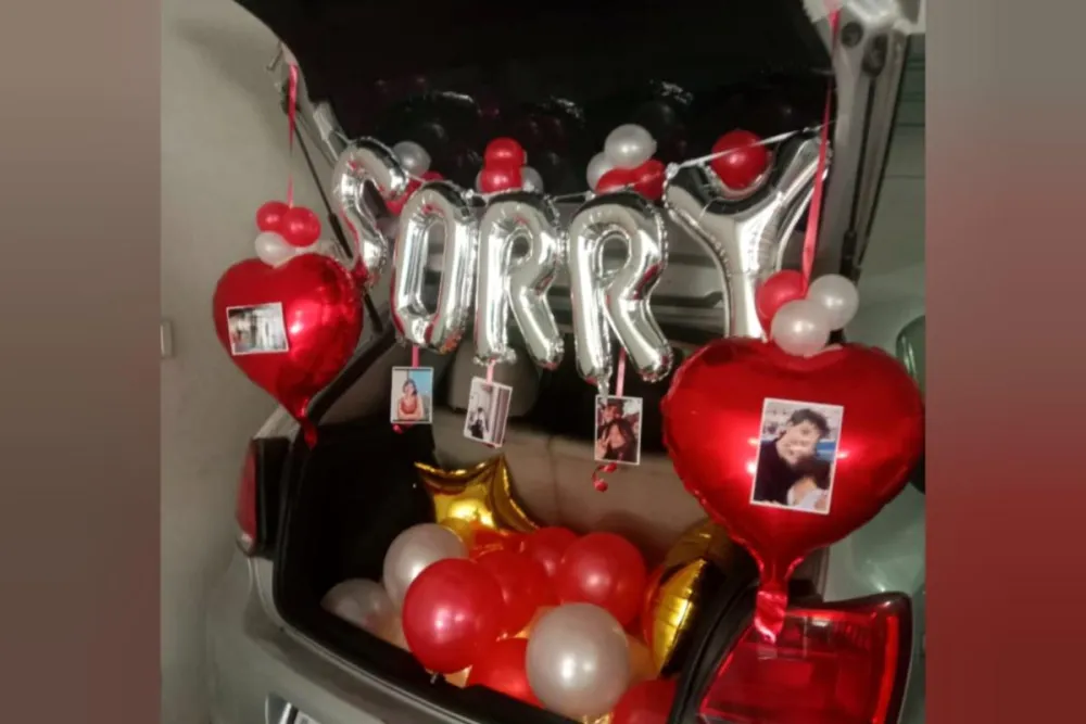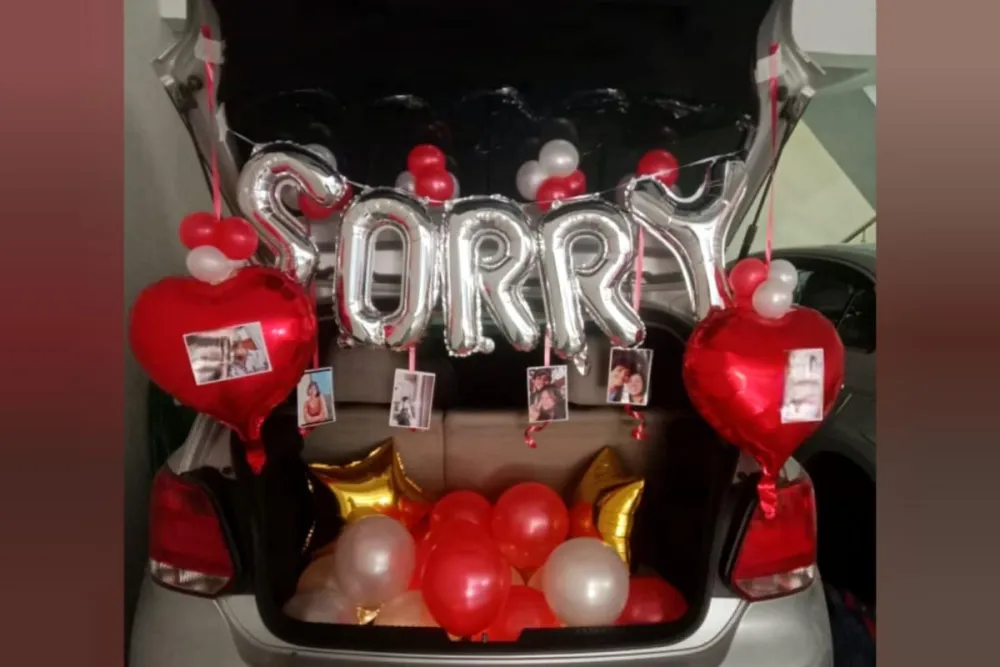 If your partner is upset, this thoughtful apology decoration is a perfect way to express your feelings. The combination of balloons, photos, fairy lights, and a “Sorry” message creates a heartfelt surprise when the car boot opens. It’s a sweet and romantic way to say sorry and make your loved one feel special again. ❤️✨🚗