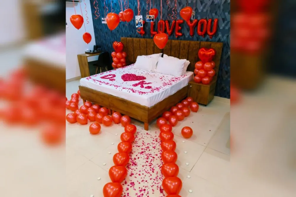 Create a beautiful and romantic atmosphere with this love theme decoration. The combination of red balloons, rose petals, candles, and personal photos makes the setup feel warm and special. It’s perfect for anniversaries, proposals, birthdays, or any occasion where you want to celebrate love and create unforgettable memories. ❤️✨